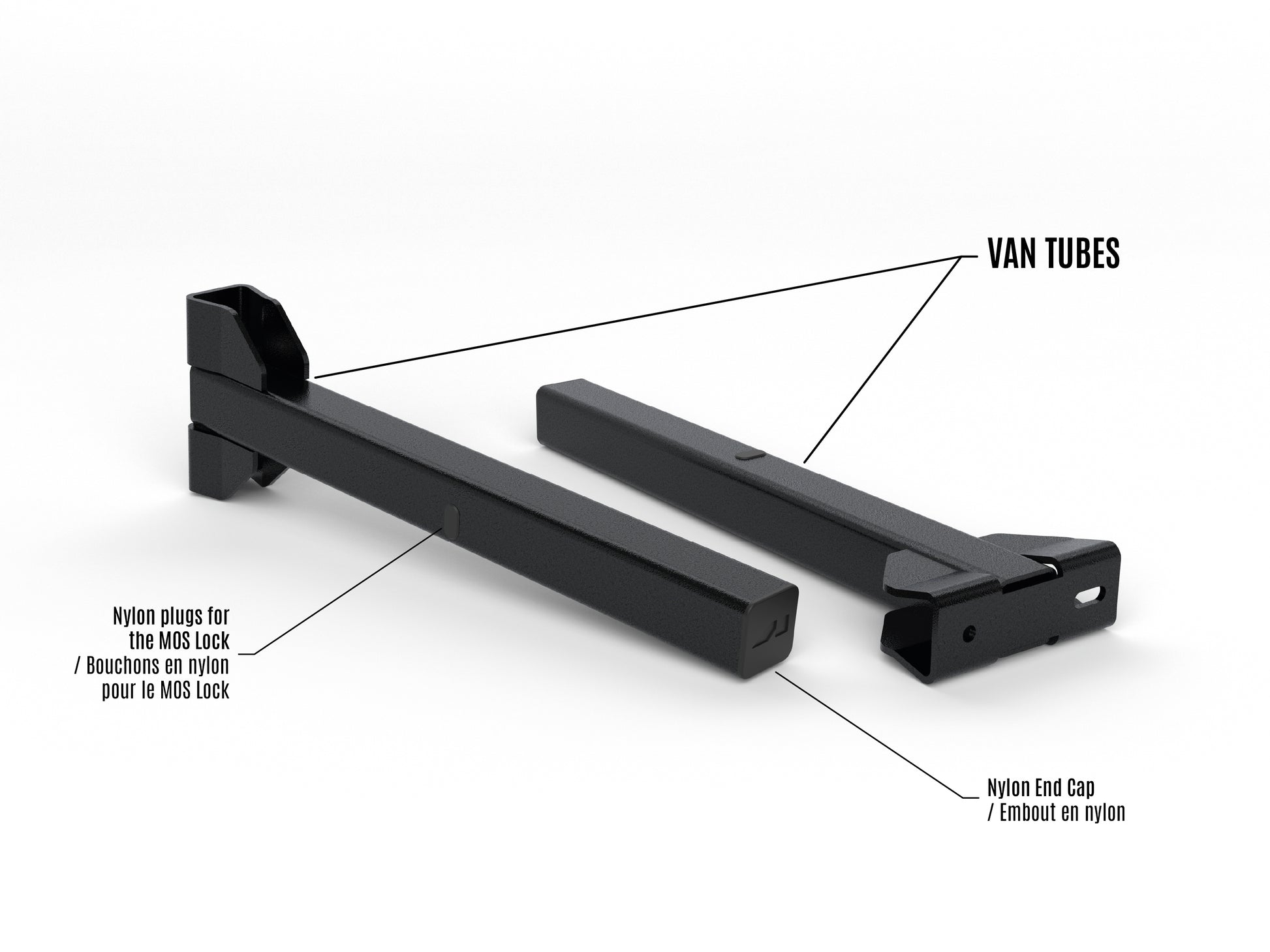 The Van Tubes are a set of arms that serve two purposes: they can be used on their own as rear-door rack arm-adapters for mounting common bike racks, or as the adapter that allows the MOS UpLift™ system to be installed on a van’s rear door rack.